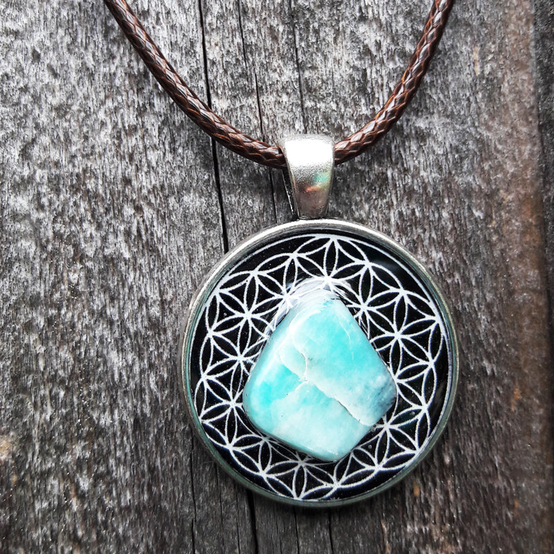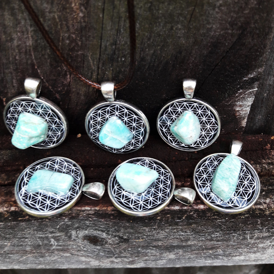 The Flower of Life is the background of these beautiful pendants. The Flower of Life is "the big picture," how everything and everyone are connected. If you're doing good things and being so positive but don't seem to be working out, you may just be on a small part of the picture but your good will come one day.