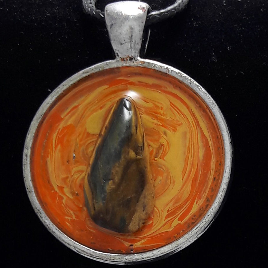 Materials: Natural gemstone, metal pendant, resin pour filled.