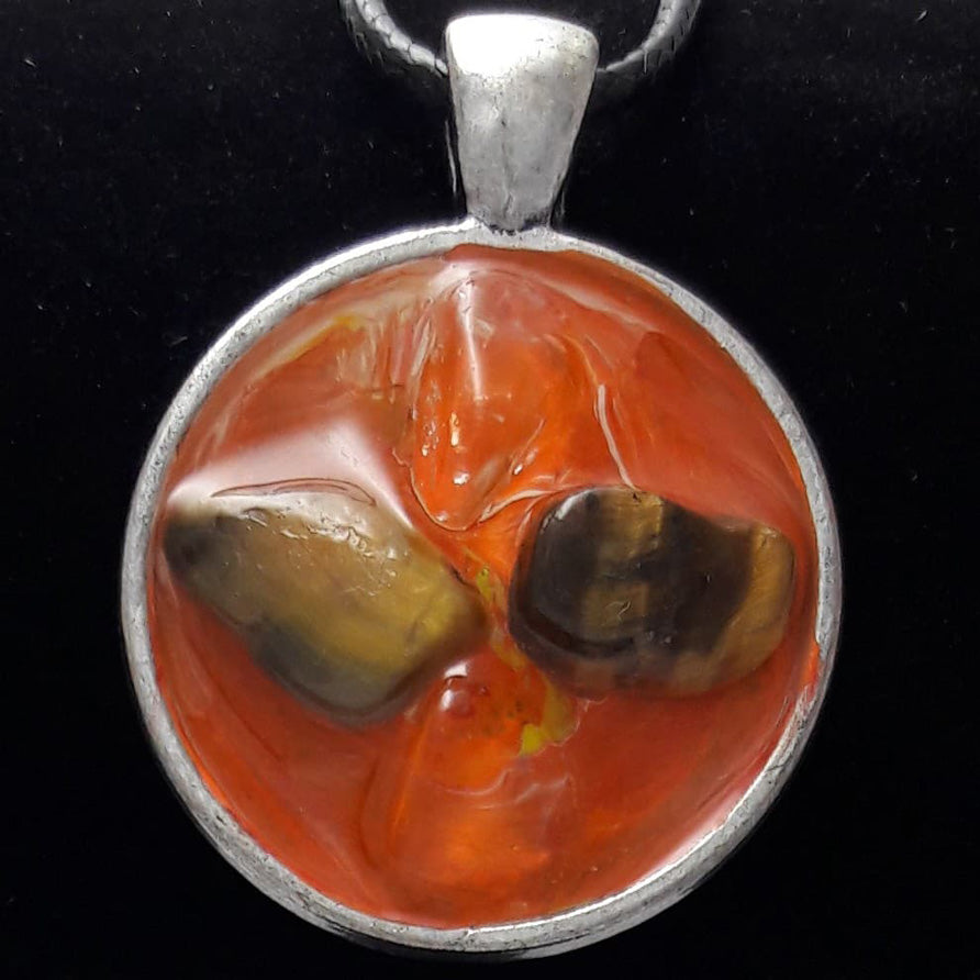Materials: Natural gemstones, metal pendant, resin pour filled.