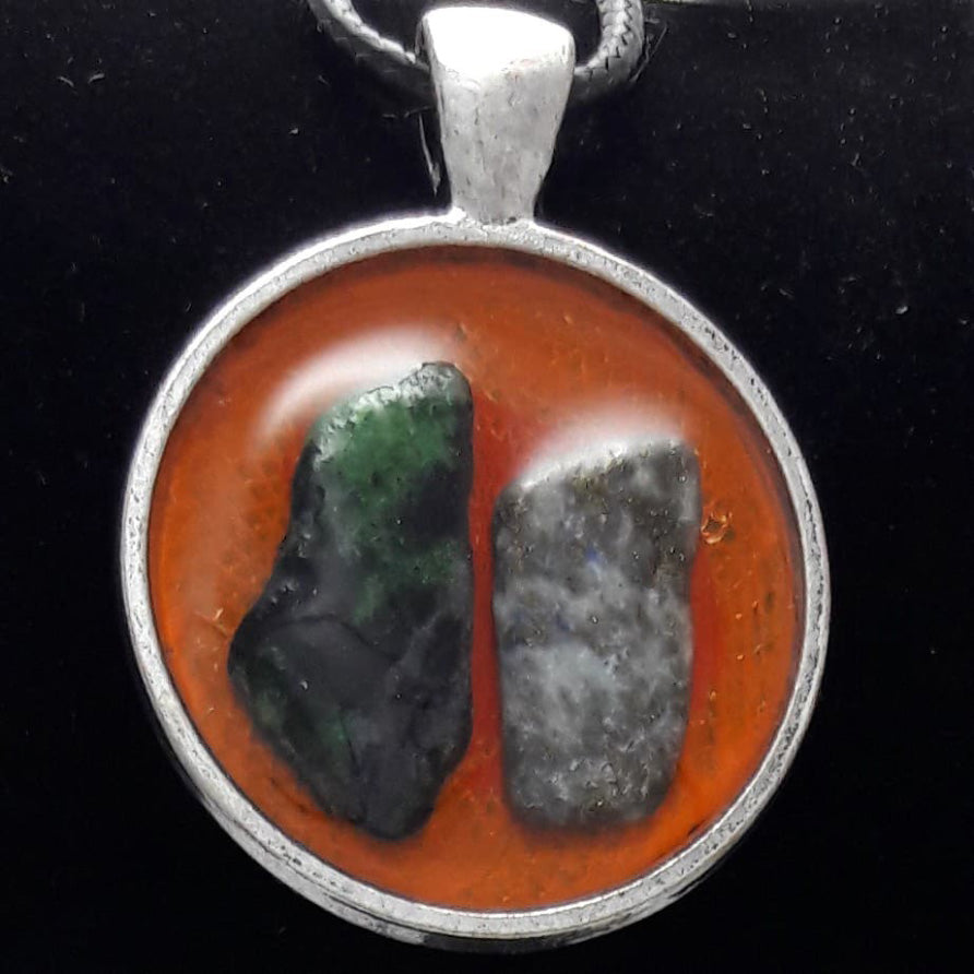 Materials: Natural gemstones, metal pendant, resin pour filled.