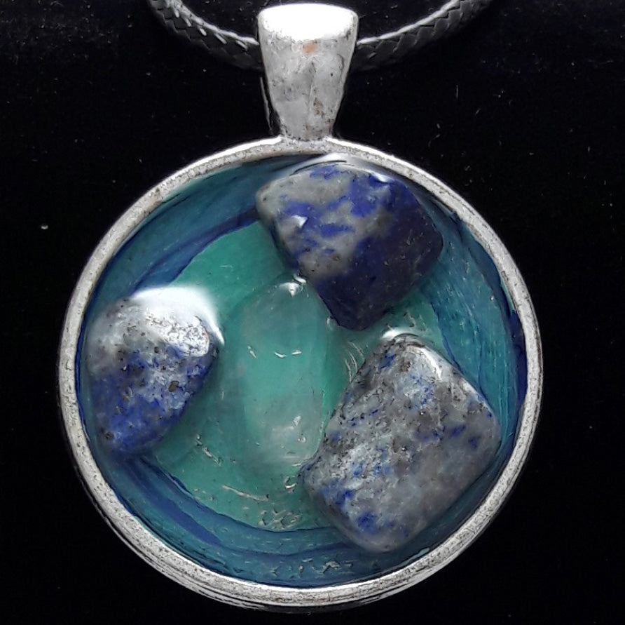 Materials: Natural gemstones, metal pendant, resin pour filled.