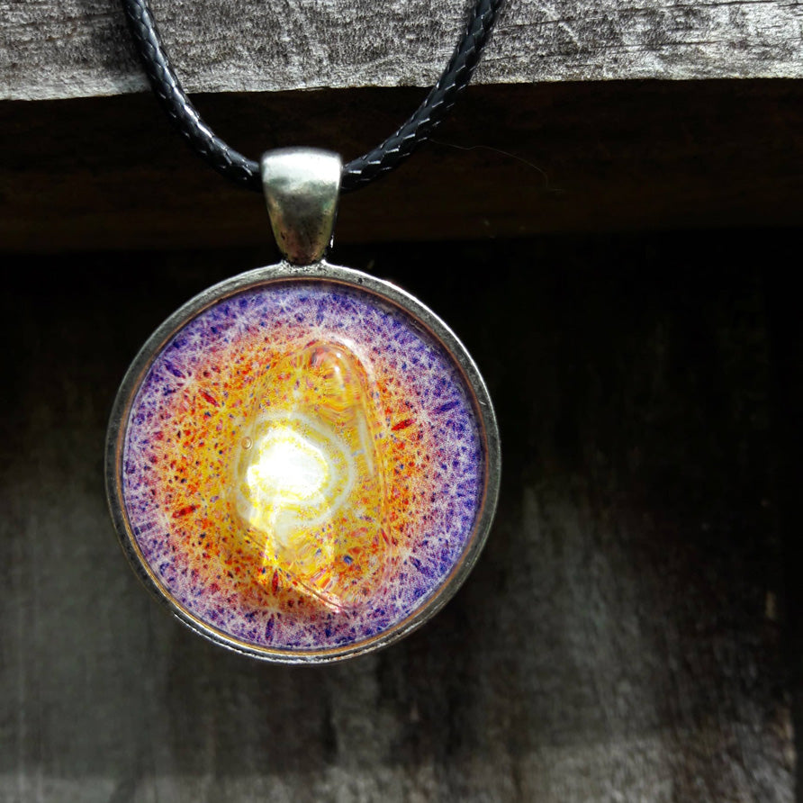 These unique pieces combine a background image with one or several natural semi-precious stones to create a personal mantra in symbolism, colors, and stone properties. Resembling rocks in a river, each piece is carefully encased in resin and cured to create a long lasting setting and finish.