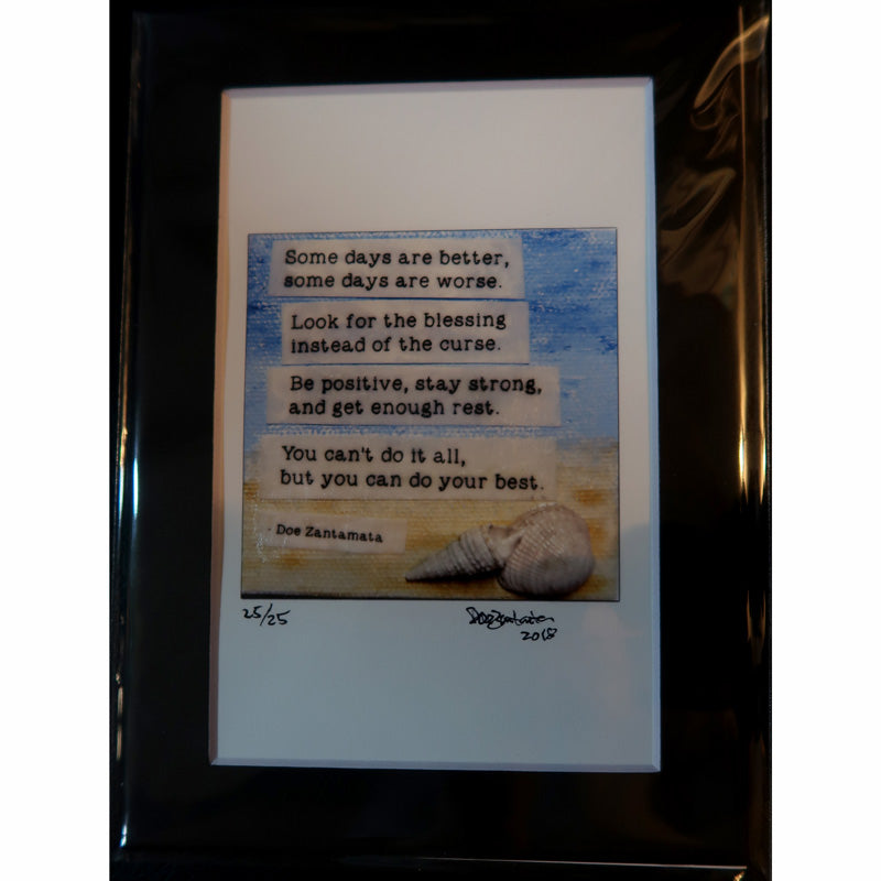 This is an original mixed media and acrylic painting on canvas by Doe Zantamata. Two seashells from Florida's East Coast grace the bottom of this beach inspired print. Signed and titled on the back.