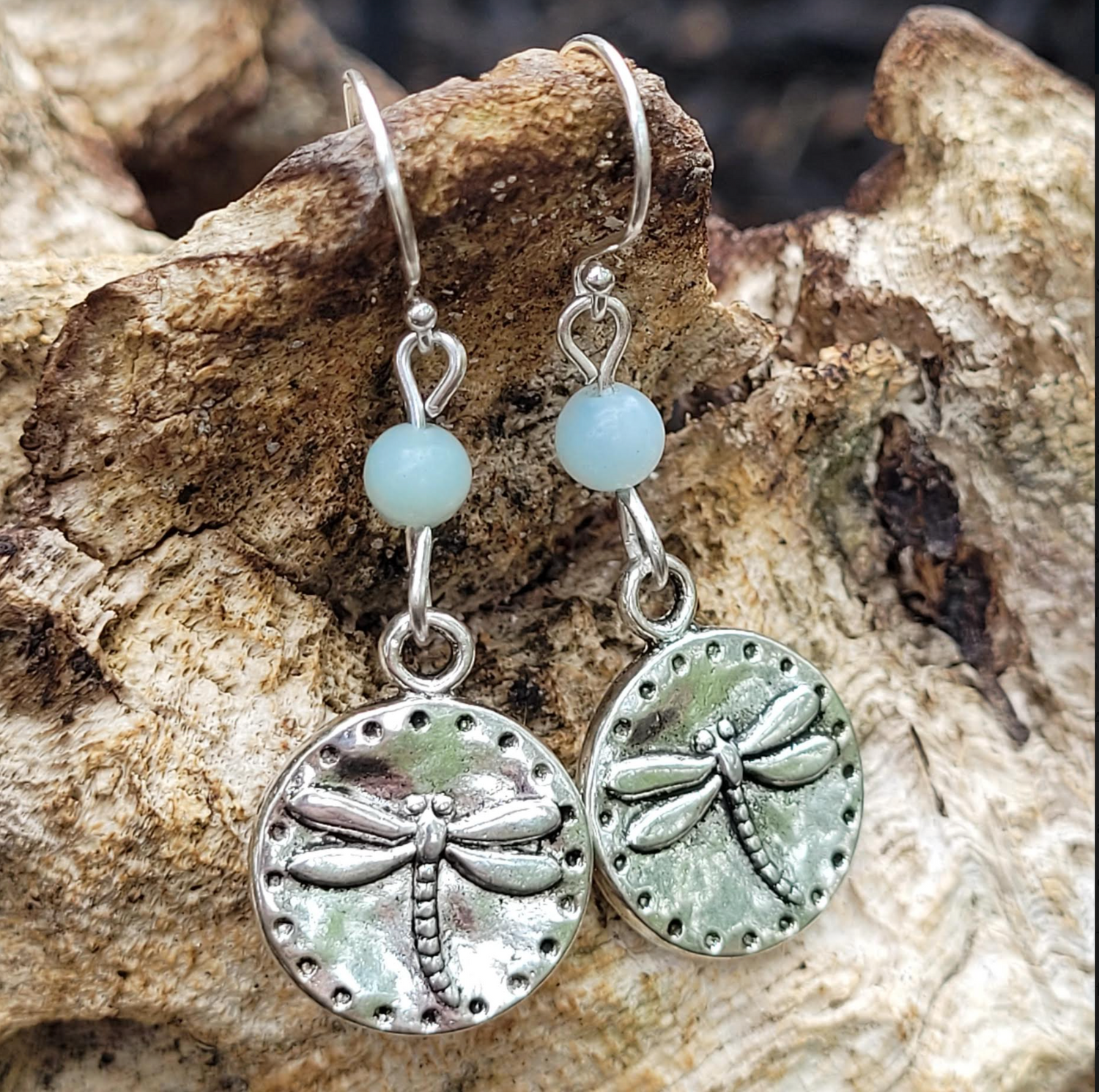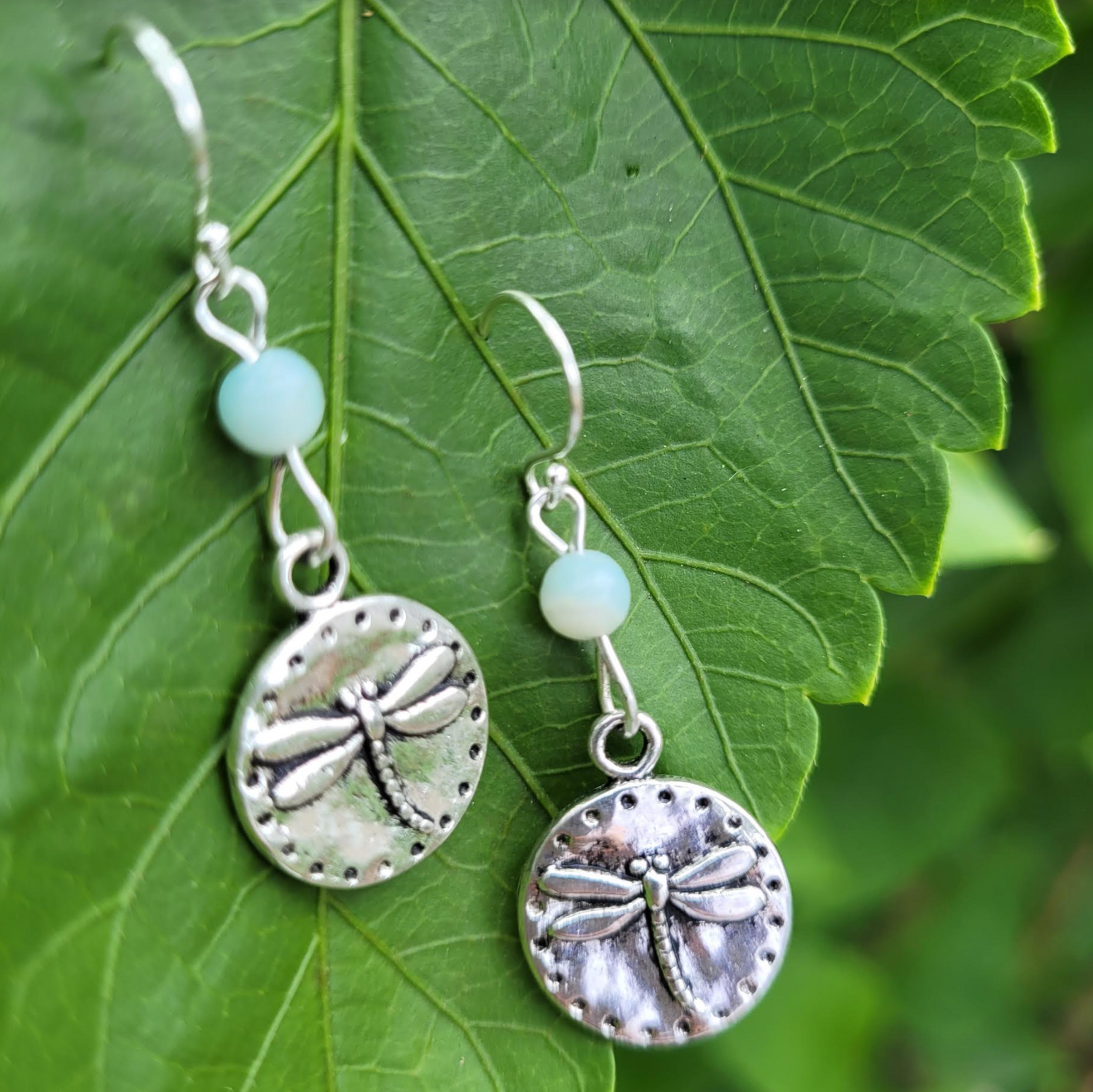 Amazonite beads are 4 mm diameter, dragonfly charms are made of white metal and are approximately dime sized at 12 mm diameter. Lightweight. Earrings come gift boxed and include small rubber backings.