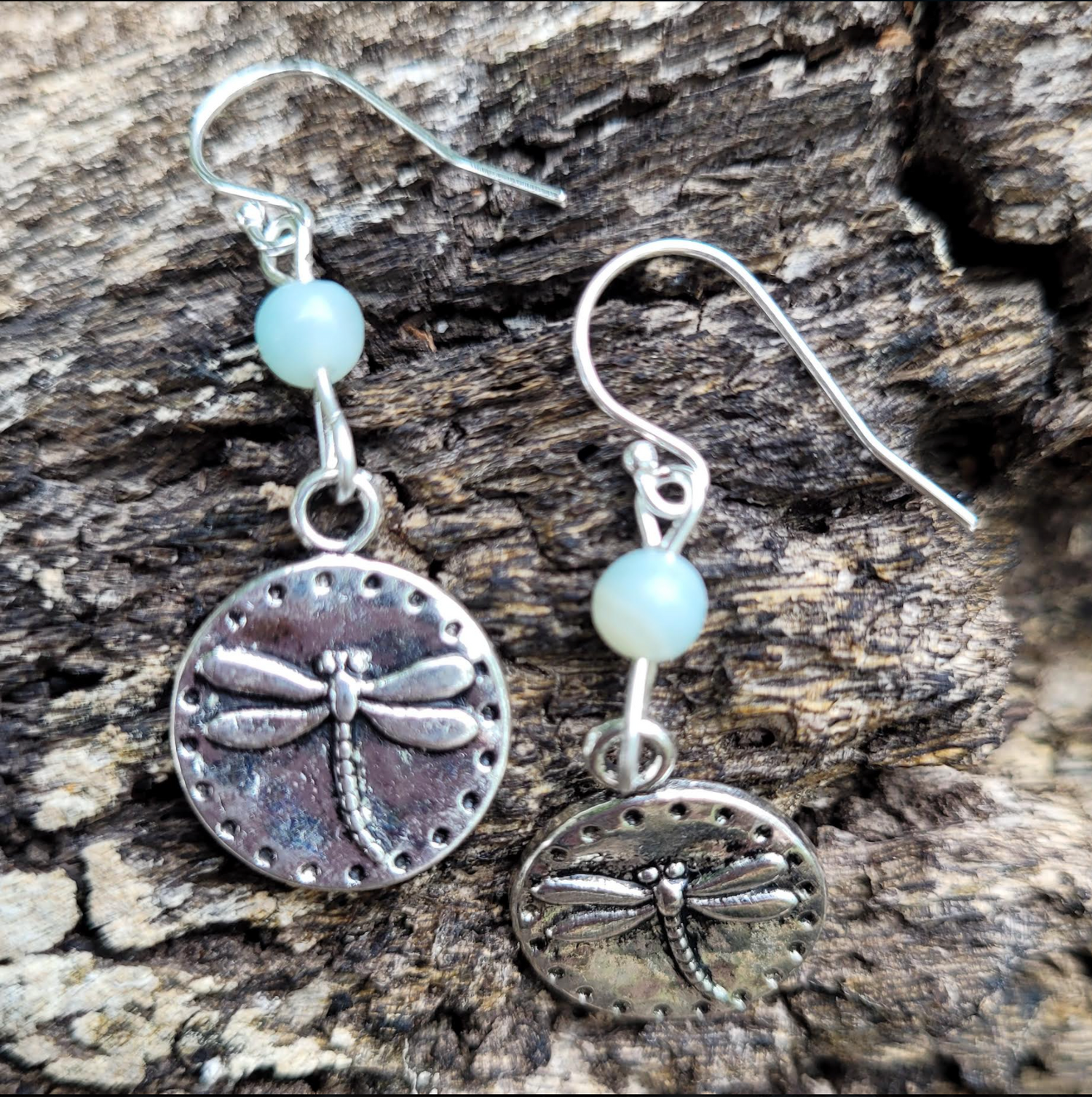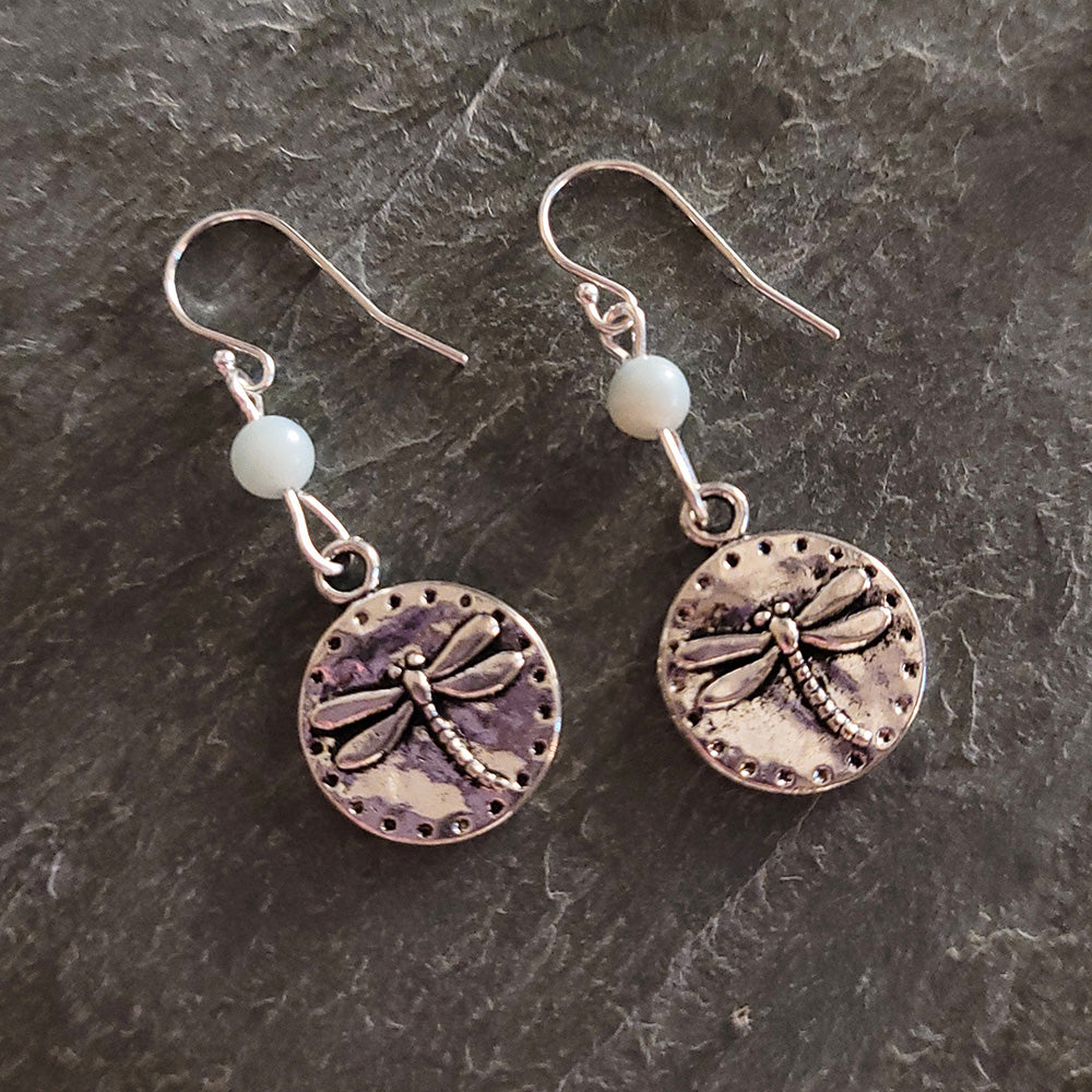 Sterling Silver Hooks lead to a natural Amazonite Bead, and dangling below is a charm with an embossed Dragonfly.