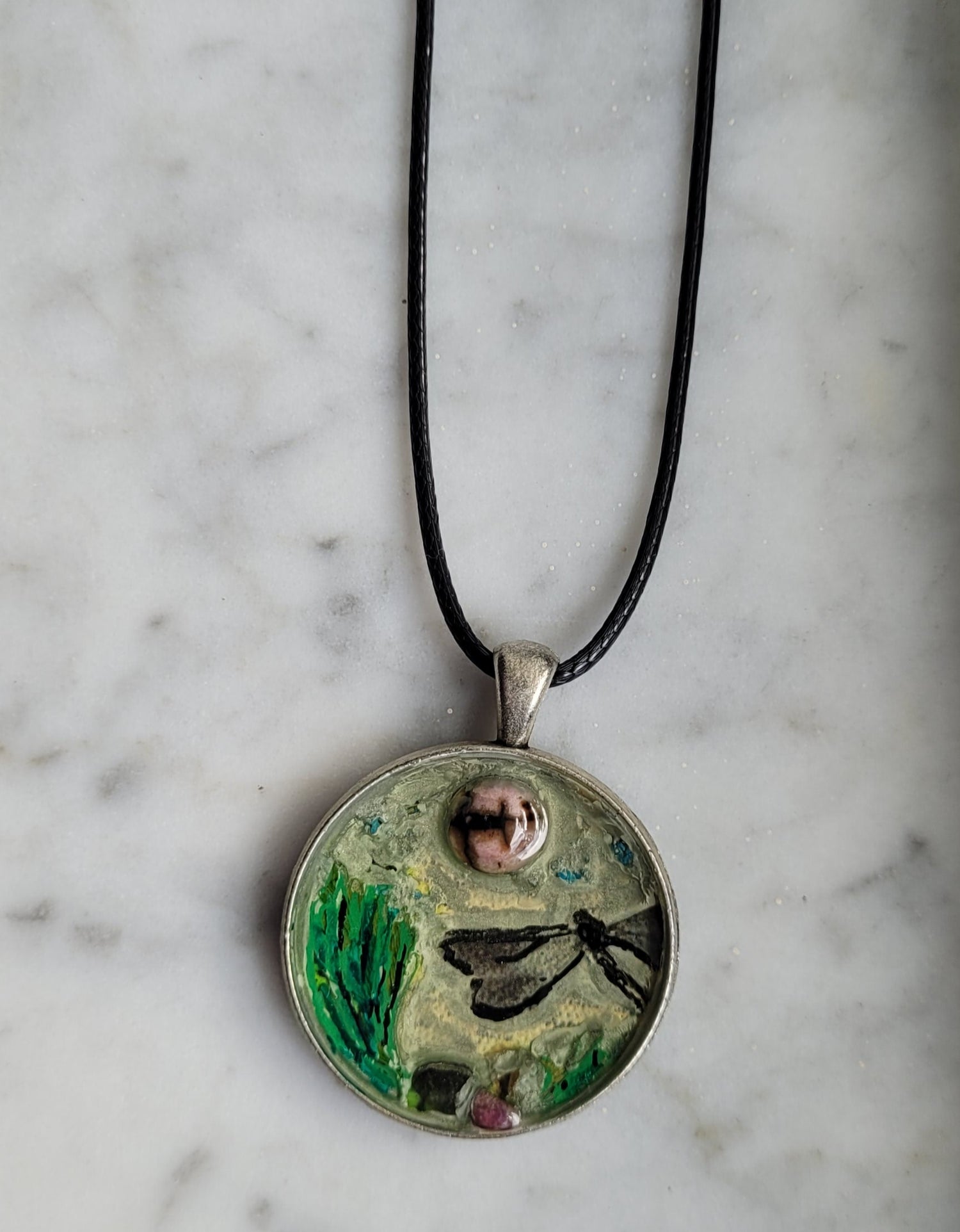 Materials: Natural gemstones, metal pendant, resin pour filled.