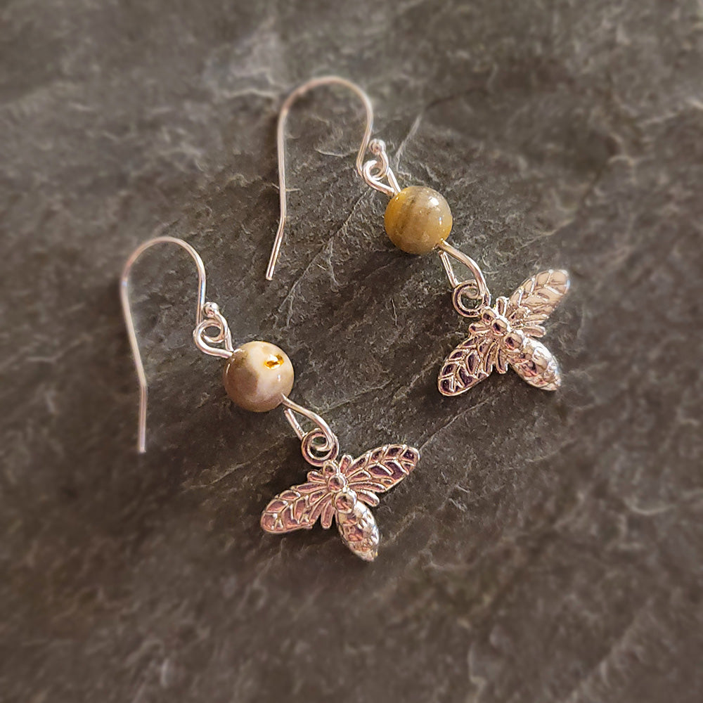 Bumblebee Jasper beads are 6 mm in diameter, Honey Bee charms are made of white metal and are 12 mm in width. Lightweight. Earrings come gift boxed and include small rubber backings.