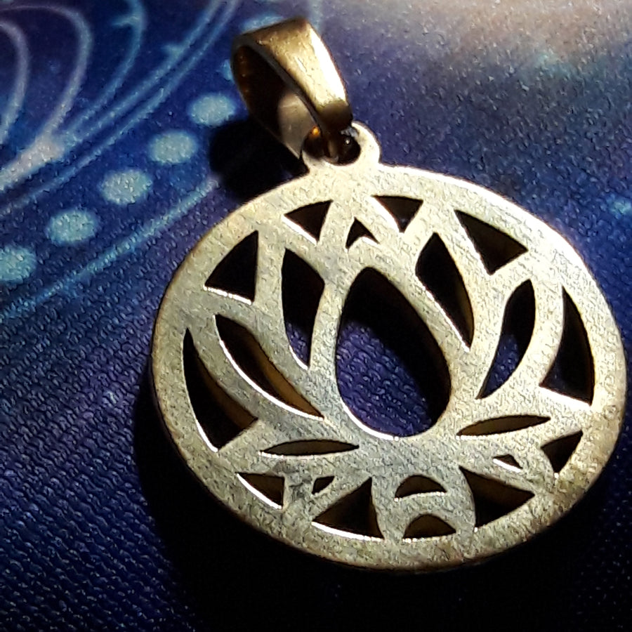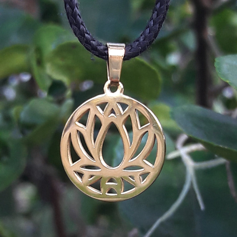 This gorgeous little gold toned Stainless Steel Lotus Pendant measures 3/4" across. Approximately the size of a US penny. It is laser cut and polished. Pendant comes on an 18" corded necklace with clasp, gift boxed.