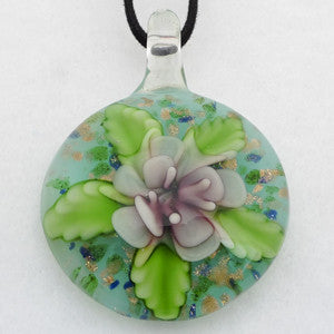 This handmade glass pendant measures 1.5" in diameter. The necklace is 18" long .