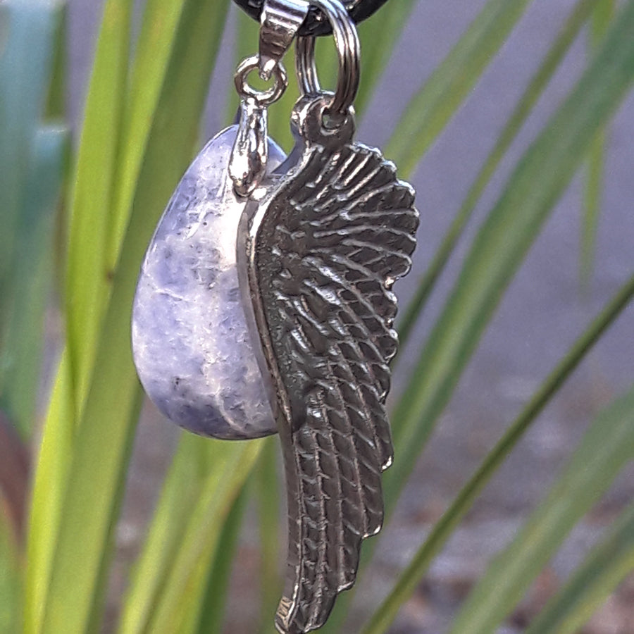 "Talk to Angels" Stainless Steel Angel Wing and Natural Sodalite Stone Necklace Set