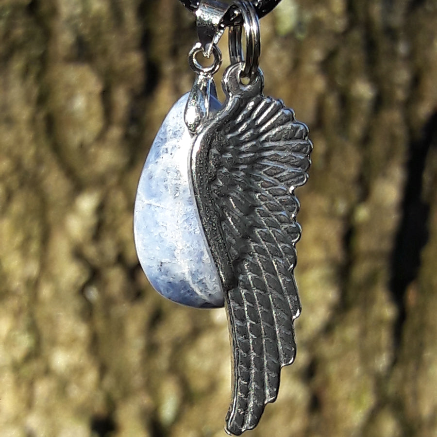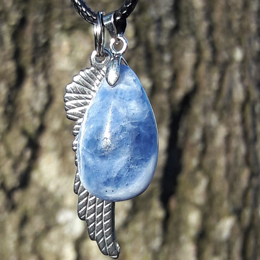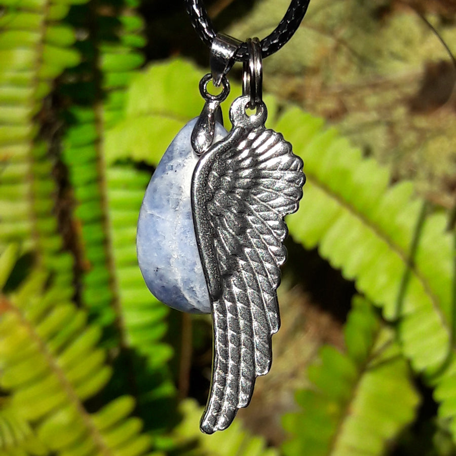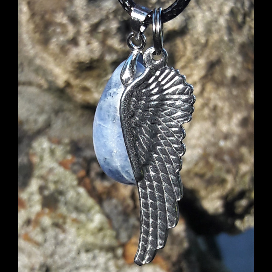 The wings pendant is large, just over 1.5" long and 0.5" wide at the widest. The sodalite is 1" long and 0.5" wide. The pendants come on an 18" vegan leather cord with clasp.
