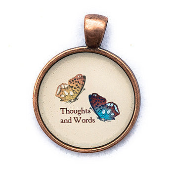 Thoughts and Words Pendant and necklace in copper tone metal with full color image.