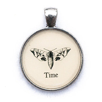 Time Pendant and necklace in silver tone metal with black and white image.