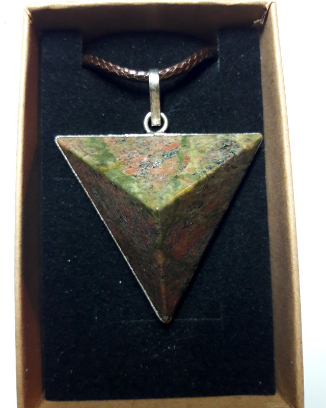 The job of a Pyramid in a pendant, then, is to draw the energy of the stone in which it's fashioned, and focus that energy toward it's base, which rests on the wearer, slightly above the heart.