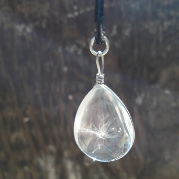 The Wish Pendant is a natural dandelion seed encased in a polyresin raindrop.